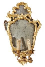 in legno intagliato e dorato, battuta sagomata attorno alla quale si avvolgono elementi fogliacei che si portano in alto a formare la cimasa ad ampio motivo rocaille centrato da specchio, centro inferiore con fiorellino dal quale si dipartono due braccetti fogliacei ricurvi sotteso da palmetta, cm 47x29