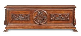 in noce, piano di forma rettangolare, fronte centrato da riserva circolare modanata a inquadrare stemma sagomato entro nastro tra cartelle laterali mistilinee intagliate a volto di cherubino tra volute, angoli intagliati a grande foglia che si porta verso l'alto, lati sformellati, una cassapanca con maniglie in ferro battuto, zampe leonine, cm 58x178x62, costruite con materiale antico