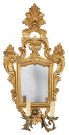 in legno intagliato e dorato, profilo rettangolare sagomato al quale si applica la fascia esterna intagliata a giorno con due volute al centro inferiore, dove si applicano i due braccetti a voluta fogliacea, sottese da foglia aperta rivolta verso il basso, che proseguono simmetricamente sui lati per formare in alto l'ampia cimasa rocaille a volute e foglie terminante in ampia foglia aperta, cm 67x36, le applique presentano patine diverse