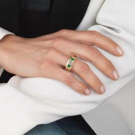 in oro giallo 18kt, al centro un diamante taglio antico di ct 1 circa, affiancato da due smeraldi taglio carré per ct 0.50 circa, mis. 55, gr. 10