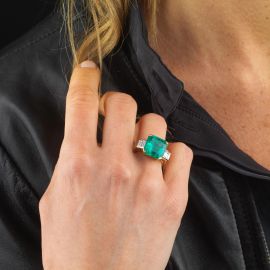 in oro giallo e bianco 18kt, al centro uno smeraldo taglio ottagonale di ct 8.70 circa, affiancato da diamanti taglio baguette per ct 0.80 circa, mis. 54, gr. 7