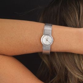 cassa in oro bianco 18kt, fondello a pressione, quadrante bianco, grafica nera, indici stampati, movimento a carica manuale cal. ETA 2510, bracciale integrato in oro bianco 18kt, fibbia in oro bianco 18kt marcata Baume et Mercier, vetro plastica, lungh. cm 17 circa, gr. 54 circa. Diam. mm 24