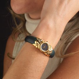 cassa in oro giallo 18kt, anse semirigide decorate in oro giallo 18kt, lunetta liscia, quadrante in pietra di colore nero, movimento al quarzo, bracciale semirigido in oro giallo 18kt e pelle di colore verde, vetro minerale. Corredato di astuccio e due bracciali di ricambio, gr. 76. Diam. mm 20