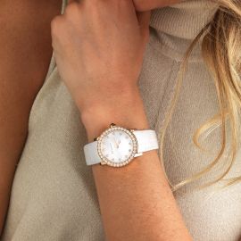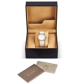 cassa in oro rosa 18kt, fondello a pressione, corona con pietra cabochon di colore rosa, lunetta con diamanti, quadrante madreperla, indici diamanti applicati, movimento al quarzo, cinturino originale in pelle di colore bianco, fibbia in oro rosa 18kt marcata Bulgari, vetro minerale. Corredato di scatola e garanzia. Diam. mm 33