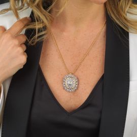 catena in oro giallo 18kt a maglia torchon, pendente trasformabile in spilla in oro giallo e bianco 18kt traforato con diamanti taglio brillante per ct 1.30 circa, punzoni 750 e del fabbricante, chiusura a moschettone, gr. 24 complessivi