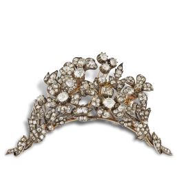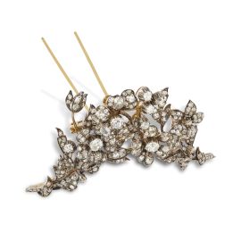 in oro e argento, impreziosite da diamanti taglio vecchio per ct 6 circa, dim. cm 4x7 e cm 4x5,5, gr. 42 complessivi. Corredate di scatola, spilla aggiuntiva e spillone per trasformarla in piccola tiara.