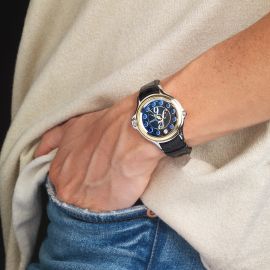 cassa in acciaio, fondello in vetro minerale, lunetta liscia in oro giallo 18kt, quadrante nero lucido, logo in acciaio applicato, numeri arabi, indici con meccanismo di rotazione con diamanti e pietre semipreziose, movimento al quarzo, cinturino nero in pelle originale, fibbia in acciaio, vetro minerale. Diam. mm 38