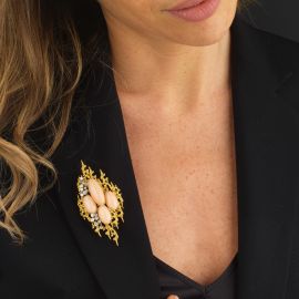 in oro giallo 18kt e platino, disegnata come una saetta e impreziosita al centro da tre coralli rosa taglio cabochon affiancati da diamanti taglio brillante per ct 1.30 circa, firmata "G.Weil", punzoni 18kt e PLAT, dim. cm 8x3,5, gr. 34