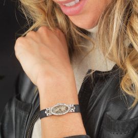 cassa di forma ovale in oro giallo 18kt, ghiera e anse in platino con diamanti taglio vecchio applicati, quadrante argenté, numeri arabi stampati, movimento a carica manuale, cinturino in seta, fibbia in oro giallo 18kt con diamanti applicati, vetro minerale, gr.14. Dim. mm 14x38
