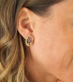 in oro giallo 18kt, impreziositi da zaffiri, rubini e smeraldi taglio rotondo per ct 0.60 circa con diamanti taglio brillante per ct 0.80 circa, punzone 750, dim. cm 1x2 circa, chiusura a clip, gr. 6 complessivi