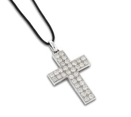in oro bianco 18kt, impreziosita da pavé di diamanti taglio brillante per ct 5 circa, dim. cm 3x5,5 circa, gr. 17. Corredata di cordoncino in cuoio.