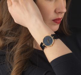 cassa in oro giallo 18kt, fondello serrato a pressione, ghiera e anse mobili con brillanti applicati, quadrante grigio antracite, grafica oro con quattro brillanti applicati, movimento a carica manuale, cinturino originale in pelle rivestito in tessuto, fibbia in oro giallo 18kt con brillanti applicati, vetro minerale. Corredato di scatola. Diam. mm 30