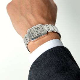cassa di forma rettangolare in acciaio, fondello serrato con viti, corona con zaffiro cabochon, quadrante soleil argenté, grafica nera, numeri romani stampati, datario a ore sei, movimento a carica automatica, bracciale in acciaio, fibbia doppia deployant in acciaio firmata Cartier, vetro minerale. Corredato di scatola e garanzia. Dim. mm 28x32