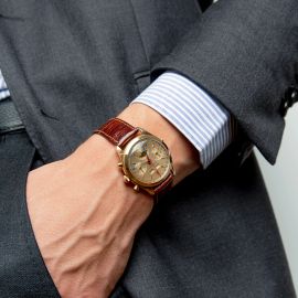 cassa in oro giallo 18kt, fondello serrato a vite marcato Sultana, tasti a pompa, lunetta liscia, quadrante champagne, indici oro applicati, complicazione fasi lunari, contatori cronografici, finestre del giorno e del mese, movimento a carica manuale cal. Valjoux 88, cinturino in pelle, fibbia di colore oro, vetro plastica. Diam. mm 36.