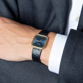 cassa ottagonale in oro giallo 18kt, corona marcata, lunetta a scalino, quadrante bitonale blu chiaro e blu scuro, grafica di colore bianco, "sigma dial", movimento a carica manuale n. 1333707 cal. 215, cinturino originale in pelle nera, fibbia originale in oro giallo 18kt, vetro minerale. Corredato di estratto di archivio. Dim. mm 29x29