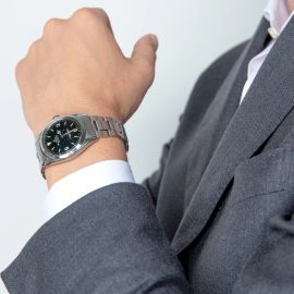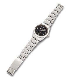 cassa in acciaio, fondello serrato a vite, corona marcata Rolex, lunetta liscia, quadrante nero lucido, grafica oro, indici e numeri arabi al trizio, movimento a carica automatica n. 89090 cal. 1570, bracciale oyster in acciaio a maglie ripiegate n. 7836 finali 358, fibbia a scatoletta marcata Rolex, vetro plastica. Diam. mm 36