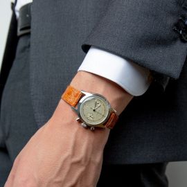 cassa in acciaio, fondello serrato a vite, tasti a pompa, lunetta liscia a scalino, quadrante argenté, indici in acciaio applicati, movimento a carica manuale cal.14W su base Venus 188, cinturino in pelle, fibbia in acciaio, vetro plastica. Diam. mm 35