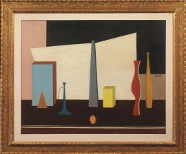on the reverse label Galleria Gissi Torino "Atanasio Soldati / tra metafisica e astrattismo / Grande composizione / 1940 / cat.18 / olio su tela - misure: 99,4x79,6"