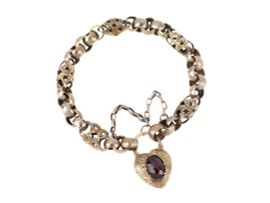 in oro 9kt, scomponibile in tre rivelando al centro un piccolo cuore nascosto, mis. 48, accompagnato da un bracciale in oro 9kt, chiusura con lucchetto a forma di cuore con al centro una pietra sintetica, mis. interna 16, corredato di scatola, gr. 19 complessivi