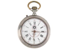 Un secondo orologio da tasca Rosskopf & Co, cassa in metallo in due parti con movimento a vista protetto da vetro minerale, quadrante bianco, numeri romani di colore nero e numeri arabi di colore rosso, movimento a carica manuale (non funzionante), vetro minerale. Diam mm 55