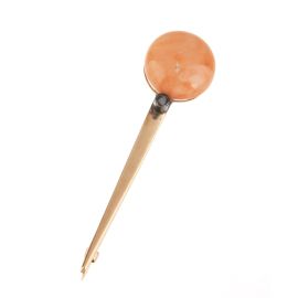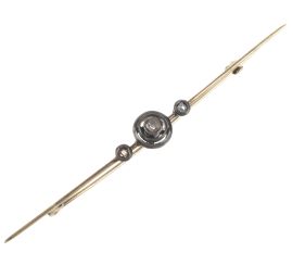 in oro e argento, una spilla con bottone in corallo di mm 18, lungh. cm 6,5; la seconda spilla con al centro tre rose di diamante, lungh. cm 8,5; dim. pendente 5x1 circa, gr. 15 circa complessivi