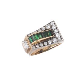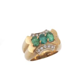 in oro giallo e bianco 18kt, di cui un anello a forma di fiocco con rubini taglio baguette per ct 0.35 circa e diamanti taglio brillante per ct 0.40 circa, punzone 750, mis. 54, gr. 12; un anello di forma geometrica con smeraldi taglio baguette per ct 1 circa e diamanti taglio baguette e brillante per ct 0.80 circa, mis. 58, gr. 8; un anello di forma geometrica con smeraldi taglio ovale per ct 1 circa e diamanti taglio brillante per ct 0.10 circa, punzoni 750 e del fabbricante, mis. 54, gr. 15; un anello in oro bianco 18kt con zaffiri taglio smeraldo per ct 2 circa e diamanti taglio brillante per ct 1.10 circa, punzone 750, mis. 53, gr. 5