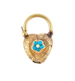 in oro giallo 18kt inciso (punta del cuore danneggiata), impreziosito da piccoli turchesi, accompagnato da una moneta araba in oro 18kt, gr. 13 complessivi