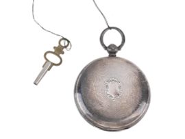 cassa guilloché in argento in tre parti, punzone inglese, quadrante di colore argento con lavorazione raffigurante fiori, indici numeri romani, secondi a ore 6, movimento a carica manuale (non funzionante), vetro plastica, corredato di chiave di carica. Diam. mm 43, gr complessivi 68 circa