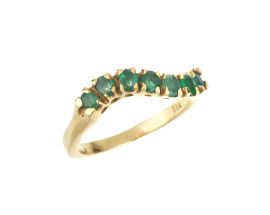 orecchini in oro 14kt e argento, smeraldi centrali taglio rotondo per ct 0.40 circa, circondati da rose di diamante, dim. cm 1x2, chiusura a monachella, gr. 6 complessivi; anello in oro giallo 18kt, una fila di smeraldi taglio ovale per ct 0.40 circa, punzone 750, mis. 53, gr. 3