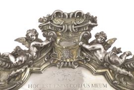 in argento e legno, base sagomata su cui poggia il sostegno realizzato da due putti in rilevo su elementi a volute, parte centrale con iscrizione incisa, cornice con due santi assisi e due putti sovrastanti che sostengono uno stendardo con il volto di Cristo, cm 74x54x19, g 5300 lordi