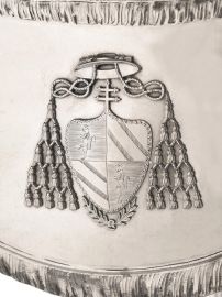 in argento, base quadrata appesantita su cui poggia un plinto su piedini sferici decorato da festoni. Il sostegno che trattiene la coppa porta olio è realizzato da quattro alti elementi curvilinei terminanti con piedi ferini. La coppa porta, olio a quattro beccucci, è sormontata da un elemento a vaso da cui si diparte la ventola con stemma cardinalizio, alt. cm 89, g 3650 lordi
