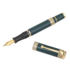 corpo in lacca verde scuro, dettagli di rifinitura su corpo e cappuccio in agento 925 dorato con ghirlande di foglie incise a ricordare la corona d'alloro che cinge i capi dei sapienti e dei vittoriosi, cappuccio sormontato dall'effige del Poeta, pennino "M" in oro giallo 18kt, punzoni Aurora e 750, caricamento a stantuffo, lungh. cm 13,5. Corredata di scatola, controscatola, inchiostro e garanzia.