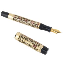 corpo decorato in lacca nera e circondato da delicati trafori placcati in oro, dettagli di rifinitura e clip placcati in oro con raffigurato su smalto rosso "Mushushu" il drago babilonese, cappuccio sormontato dall'emblema a stella bianca, pennino in oro giallo 18kt, punzoni Montblanc e 750, caricamento a stantuffo, lungh. cm 14. Corredata di scatola, controscatola e garanzia.