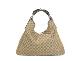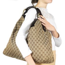 in tessuto Original GG, da portare a mano o sottospalla, larga tracolla con dettaglio Horsebit in metallo color oro lucido, rifiniture in pelle marrone con dettaglio a cucitura sul bordo, fodera in tela marrone con tasca interna chiusa con zip. Con dustbag originale.