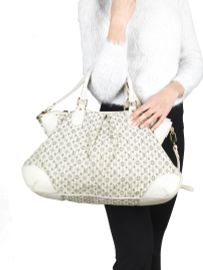 in tela di lino con piccolo Monogram grigio su base a righe bianco/ecrù, doppio manico in pelle bianca come gli angoli alla base, tracolla staccabile e regolabile con suo passaspalla, dettagli in metallo in ottone. Con dustbag originale.