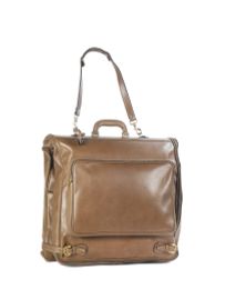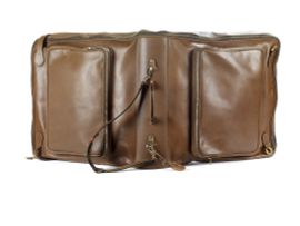 in una bella pelle ingrassata di colore marrone, tracolla regolabile e removibile con nastro rosso e verde, tasca esterna, fodera in cotone. Ingombro aperto cm 112. Con 3 appendiabiti estraibili.
