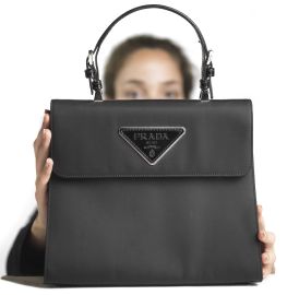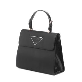 in tela vela nera, di forma trapezoidale rigida, maxi logo in pelle sulla patta frontale, maniglia in pelle spazzolata, metalleria color argento, base in pelle con piedini in metallo, chiusura a calamita e fodera con logo all over, una tasca interna con zip.