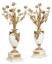 in marmo e bronzo dorato, vaso poggiante su piede circolare con fusto baccellato e base cesellata a fogliette ricorrenti, poggiante su alto piedistallo quadrangolare modanato ornato sul fonte da fregio di putti musicanti e danzanti entro riserva sagomata, anse in foggia di volto di ariete, collo circolare ornato all’attacco da fogliette e sul bordo da perlinatura dal quale si dipartono fiori, cm 82x35x35