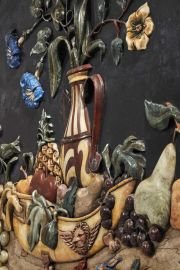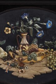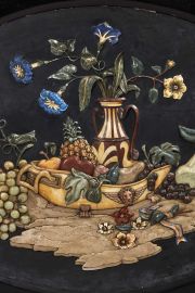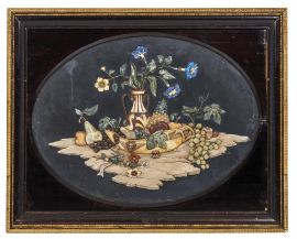 di forma ovale in marmi e pietre dure policromi a rilievo, a raffigurare natura morta con una cesta di frutta poggiante su piedi leonini, dietro alla quale è un vaso biansato con fiori policromi, su base naturalistica sulla quale poggiano un mazzetto di fiori trattenuto da nastri e altra frutta; entro cornice non pertinente in legno ebanizzato e dorato con battuta a gole lisce su bordo perlinato cui segue fascia sagomata che risale su bordino a fusarole alternate a tre perle per proseguire con gola liscia su fascia a fogliette ricorrenti, cm 134x169