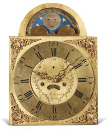 in mogano, cassa di forma architettonica con colonnine scanalate ai lati a sostenere il coronamento realizzato in foggia di due volute che inquadrano al centro sfera sormontata da aquila, quadrante in lamina dorata con numeri romani per le ore e arabi per i minuti e doppio foro di carica sormontato da fasi lunari, firmato Robinson Larne e inquadrato da ramages vegetali che si dipartono da volto centrale, sportello di forma sagomata inquadrato ai lati da colonnine, l’intera superficie ornata da filettature in legno chiaro a inquadrare piuma di mogano, base modanata su piedi a mensola, cm 230x53x26