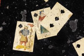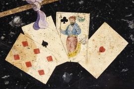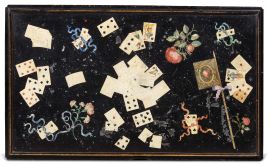 in scagliola raffigurante trompe-l'œil con carte da gioco, bouquet di fiori tra nastri e stendardo, una carta reca la scritta C. PANACERATI, l'altra E DE GENOA 1791, su tavolo non pertinente in legno ebanizzato e radica con fascia sottopiano profilata a motivo geometrico a inquadrare specchiatura in radica e gambe tornite poggianti su sostegni a doppia voluta riunite da traversa a torchon a sostenere vaso al centro, cm 77x127x75,5