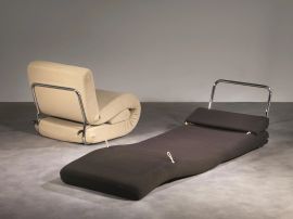 TWO «POPPY» ARMCHAIRS, CHROMED METAL STRUCTURE AND FABRIC-COVERED FOAM RUBBER