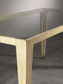 A TABLE, WOODEN STRUCTURE COVERED WITH PARCHMENT, GLASS TOP