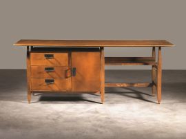A DESK, WOODEN STRUCTURE AND METAL DETAILS