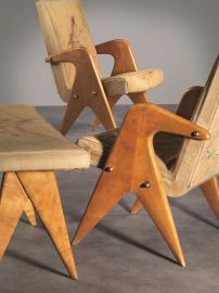A PAIR OF ARMCHAIR AND STOOL, WOODEN STRUCTURE, PAINTED FABRIC UPHOLSTERY