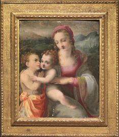 Il dipinto offerto presenta con alcune variazioni un’idea compositiva di Michele Tosini detto Michele di Ridolfo del Ghirlandaio (Firenze 1503–1577), erede della bottega di Ridolfo Ghirlandaio appunto, ritenuta tra le più grandi e rinomate a Firenze. Idea apprezzatissima, a giudicare dai numerosi esemplari accostati alla sua mano e alla sua cerchia che presentano la Madonna con seduto in grembo il Bambino che affettuosamente abbraccia San Giovannino entro un paesaggio. Tra queste si ricordano le opere conservate presso la Pinacoteca Comunale di Faenza e alla Glasgow Art Gallery and Museum e una in una collezione privata, nota attraverso una fotografia appartenuta a Federico Zeri (Fondazione Zeri, numero scheda 36445), che per l’impostazione e gli scambi di sguardi tra le figure, soprattutto quello del Bambino rivolto allo spettatore, si dimostra la più prossima all’esemplare qui descritto.