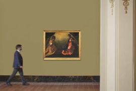 Il dipinto replica la lunetta di Andrea del Sarto, oggi conservata presso la galleria Palatina di Firenze che, secondo la testimonianza di Vasari fu eseguita quale coronamento della pala con la Madonna e otto santi per Sarzana, andata poi perduta nell’incendio dello Staatliches Museum di Berlino, ma rimasta a Giuliano Scala come saldo di un pagamento mancato da parte dei committenti e ridotta a rettangolo con l’aggiunta di due brani laterali con tendaggi. Fu poi acquistata da Ferdinando dei Medici nel 1580.