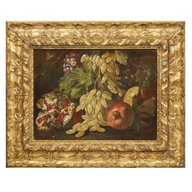 Essenziale negli elementi compositivi, questa inedita natura morta di frutta presenta, disposti su un piano – verosimilmente per terra, all’aperto – tutti i motivi tipici di questo genere nella scuola napoletana.