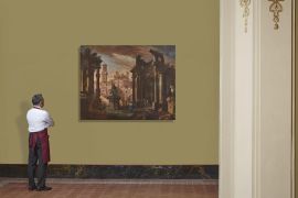 ARCHITECTURAL CAPRICCIO WITH FIGURES AROUND A MONUMENTAL SCULPTURE