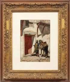 Uomo e cavallo in attesa fuori da portoni di palazzi arabeggianti o da botteghe meno sontuose sono un soggetto più volte indagato dal pittore in questo periodo di attività, l’ultimo, trascorso in Oriente prima del rientro definitivo in Europa.